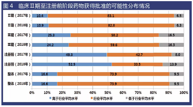 從統(tǒng)計數(shù)據(jù)來看,2018年“注冊前”藥物獲得批準(zhǔn)的可能性高于行業(yè)平均水平的藥物比例約為52.5%,較2017年(49.3%)有所升高;臨床Ⅲ期情況則相反,2018年獲得批準(zhǔn)的可能性高于行業(yè)平均水平的藥物比例為24.2%,較2017年(25.3%)有所下降。從臨床研究階段的整體數(shù)據(jù)看,2018年在研藥物獲批可能性的分布情況,與2017年數(shù)據(jù)基本一致。