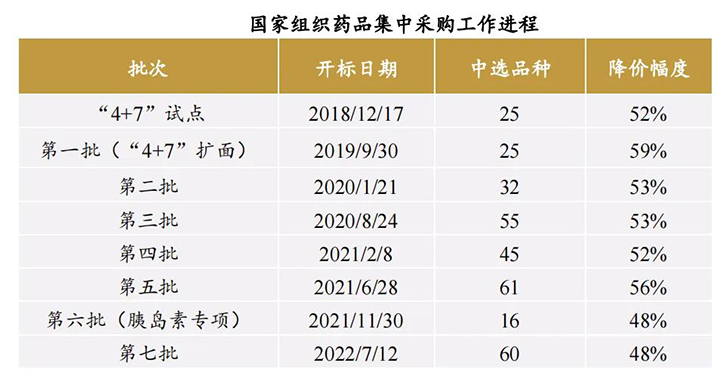 從2018年國家醫(yī)保局成立為起點(diǎn),截至 2022 年第二季度末,我國國家組織藥品集中采購已開展近5年。5年間,涉及7 批國家組織藥品集中采購,覆蓋 294 種藥品,按集采前價(jià)格測算,涉及金額約占公立醫(yī)療機(jī)構(gòu)化學(xué)藥、生物藥年采購額的 35%,一大批常見藥、慢病藥、抗癌藥價(jià)格大幅降低,平均降幅 53%。