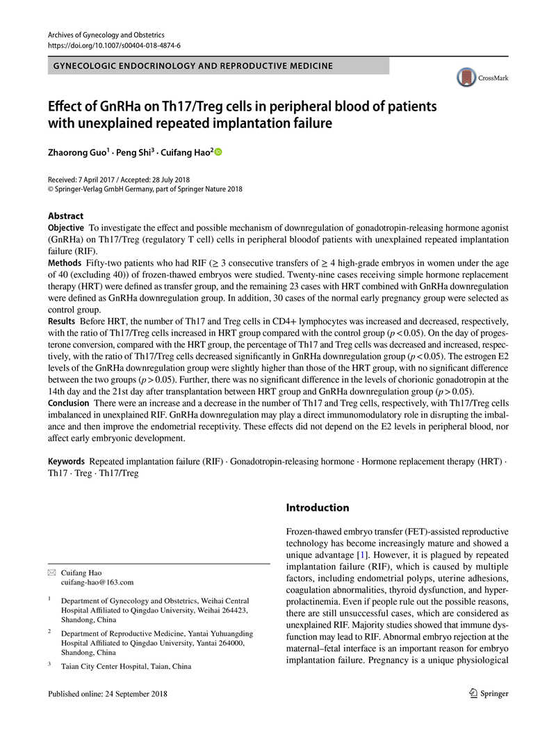結(jié)論:在不明原因的RIF患者中,Th17和Treg細(xì)胞數(shù)量分別增加和減少,Th17 / Treg細(xì)胞比值失衡。GnRHa降調(diào)可能通過阻斷Th17/Treg細(xì)胞比值失衡發(fā)揮免疫調(diào)節(jié)作用從而提高子宮內(nèi)膜容受性。這些作用不依賴于外周血中的E2水平,也不影響早期胚胎發(fā)育。