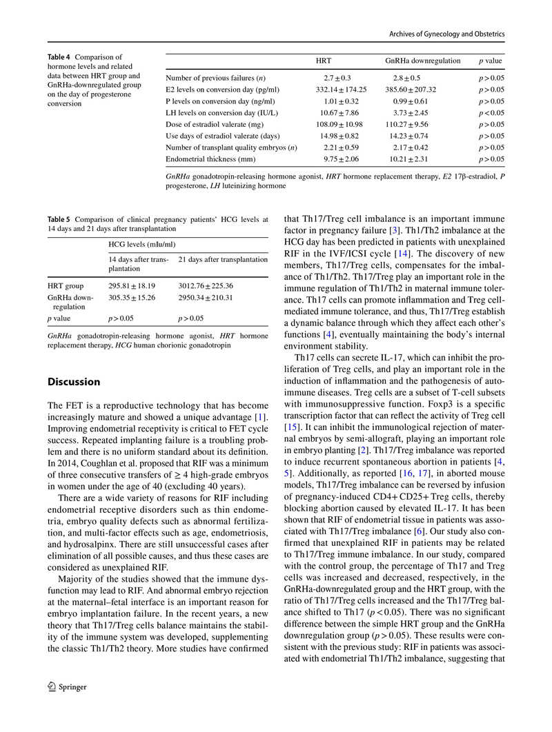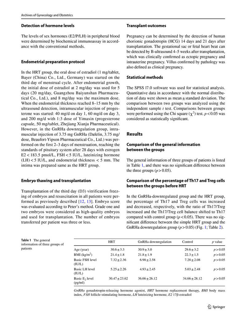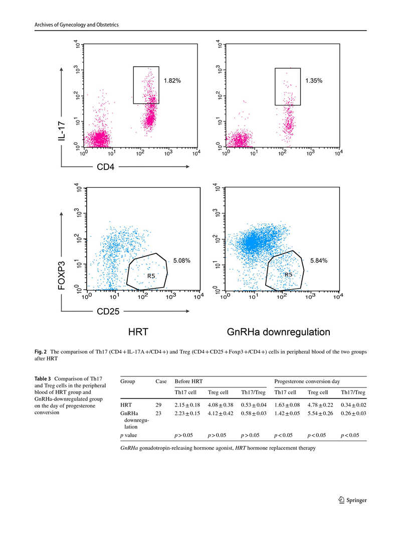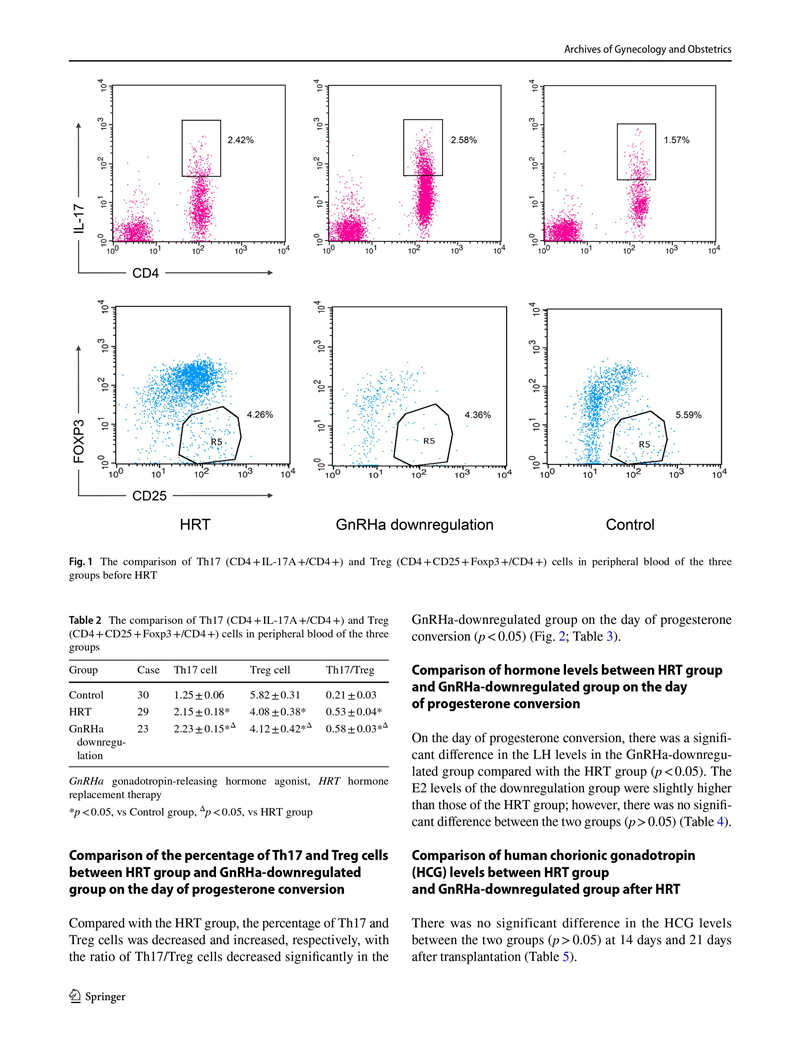 結(jié)果:HRT前,HRT組與對照組相比,CD4+淋巴細(xì)胞中的Th17和Treg細(xì)胞數(shù)量分別增加和減少,Th17 / Treg細(xì)胞比值升高(p<0.05)。在孕酮轉(zhuǎn)化當(dāng)天,與HRT組相比,GnRHa降調(diào)組的Th17和Treg細(xì)胞百分比分別降低和升高,Th17 / Treg細(xì)胞比值顯著降低(p<0.05)。GnRHa降調(diào)組的雌激素(E2)水平略高于HRT組,兩組間差異無統(tǒng)計(jì)學(xué)意義(p> 0.05)。此外,HRT組和GnRHa降調(diào)組在移植后第14天和第21天的絨毛膜促性腺激素水平?jīng)]有顯著差異(p>0.05)。