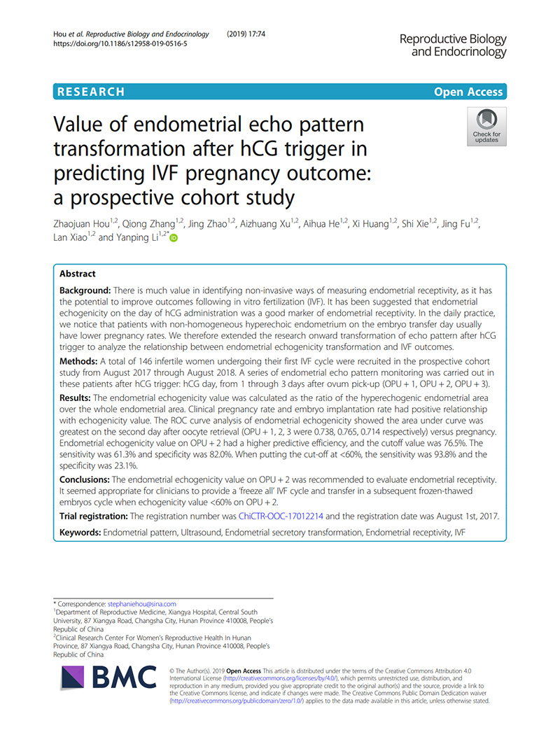 背景:非侵入性測量子宮內(nèi)膜容受性的方法很有價(jià)值,因?yàn)樗锌赡芨纳企w外受精(IVF)結(jié)局。有人認(rèn)為hCG給藥當(dāng)天的子宮內(nèi)膜回聲是子宮內(nèi)膜容受性的良好標(biāo)志。在日常實(shí)踐中,我們注意到胚胎移植日子宮內(nèi)膜非均質(zhì)高回聲的患者通常妊娠率較低。因此,我們將延伸擴(kuò)展了hCG觸發(fā)后子宮內(nèi)膜回聲模式轉(zhuǎn)化的研究,以分析子宮內(nèi)膜回聲改變與IVF結(jié)局之間的關(guān)系。