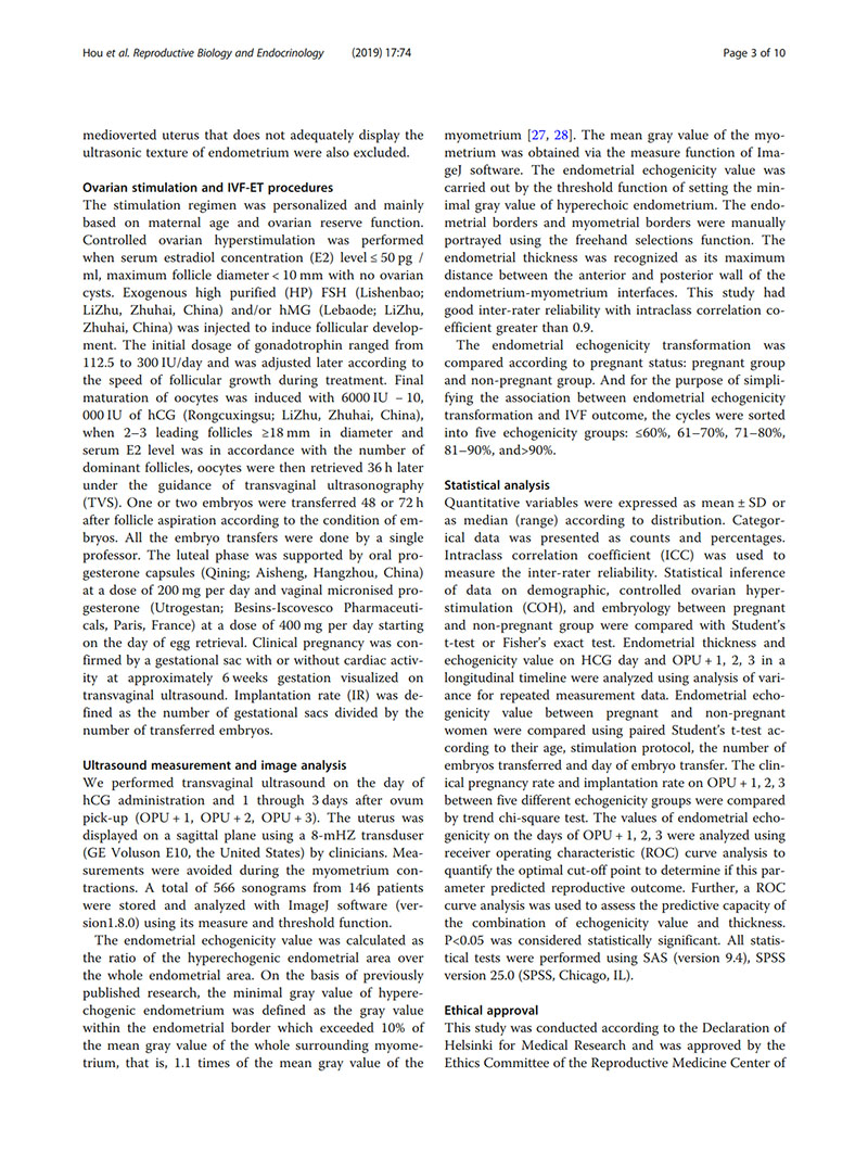 方法:在2017年8月至2018年8月,前瞻性隊(duì)列研究共招募了146名首次接受體外受精周期的不孕女性。監(jiān)測這些患者在hCG日和取卵后1-3天(OPU + 1, OPU + 2, OPU + 3)的子宮內(nèi)膜回聲模式。