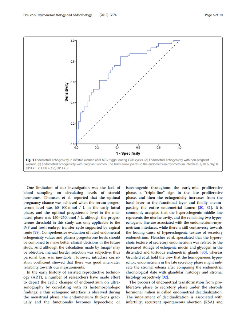 結(jié)論:建議用取卵后第2天(OPU+2)的子宮內(nèi)膜回聲值評價(jià)子宮內(nèi)膜容受性。當(dāng)OPU+2的回聲值<60%時(shí),臨床醫(yī)生似乎適合提供“全冷凍”IVF周期,并在隨后的凍融胚胎周期中進(jìn)行移植。