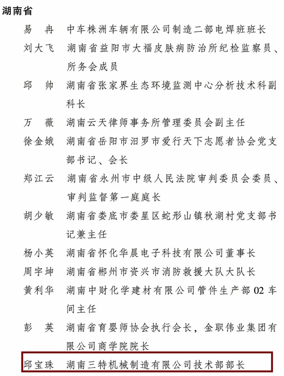 為表彰先進(jìn)、樹立榜樣,進(jìn)一步引領(lǐng)和激勵(lì)廣大婦女堅(jiān)定不移聽黨話、跟黨奮進(jìn)新征程,豪情滿懷、意氣風(fēng)發(fā)投入推進(jìn)中國(guó)式現(xiàn)代化的偉大實(shí)踐,日前,全國(guó)婦聯(lián)決定授予10人全國(guó)三八紅旗手標(biāo)兵稱號(hào),298人全國(guó)三八紅旗手稱號(hào),授予199個(gè)單位全國(guó)三八紅旗集體稱號(hào),其中,來自桃源的湖南三特機(jī)械制造有限公司技術(shù)部部長(zhǎng) 邱寶珠 獲得全國(guó)三八紅旗手榮譽(yù)。