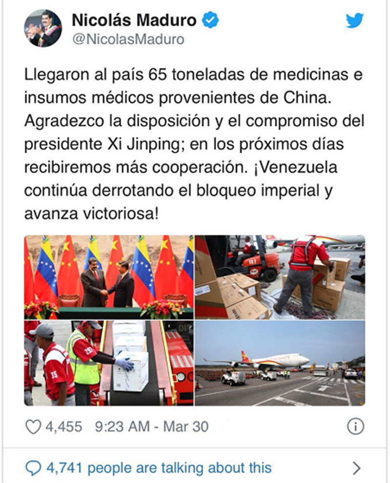 委內(nèi)瑞拉外長(zhǎng)阿雷亞薩、衛(wèi)生部長(zhǎng)阿爾瓦拉多、經(jīng)濟(jì)和財(cái)政部長(zhǎng)塞爾帕以及中國(guó)駐委大使李寶榮等到機(jī)場(chǎng)迎接。委內(nèi)瑞拉總統(tǒng)馬杜羅在電視講話(huà)中和個(gè)人推特賬號(hào)上表示“這是真正的人道主義援助,感謝中國(guó)政府和人民對(duì)委人民的支持?!?/span>